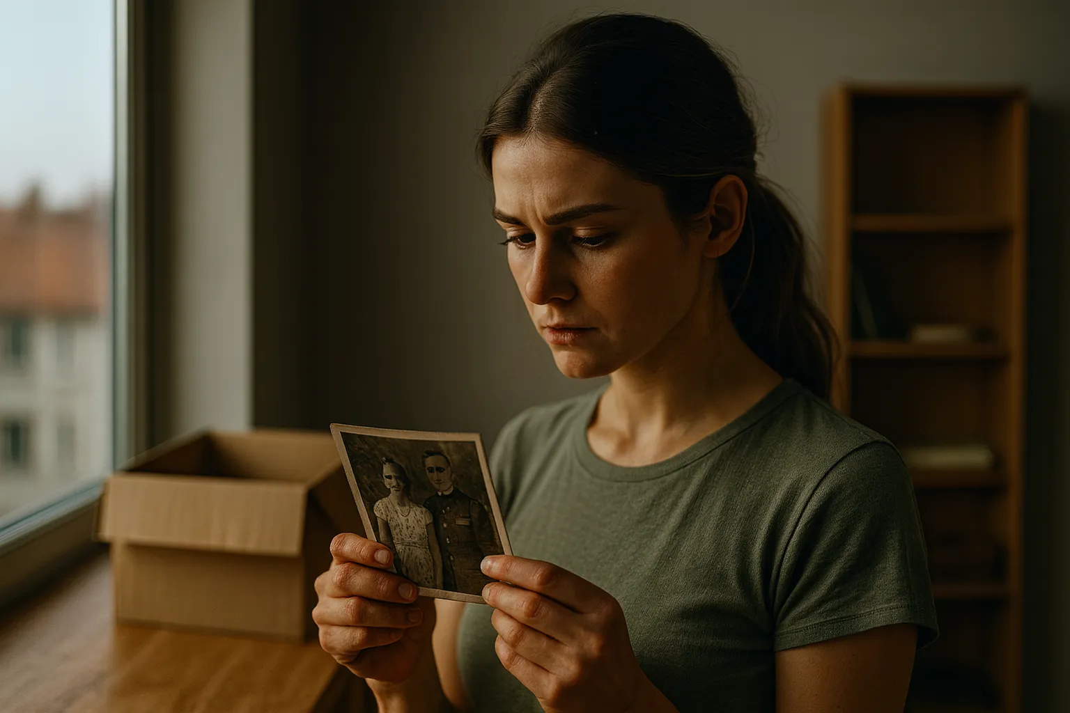 Алёна кивнула и взялась за нижнюю полку серванта, где в глубине лежали старые папки и коробки. Пыль щекотала нос, стекло чуть дрожало, когда она выдвигала стопки пожелтевших конвертов.