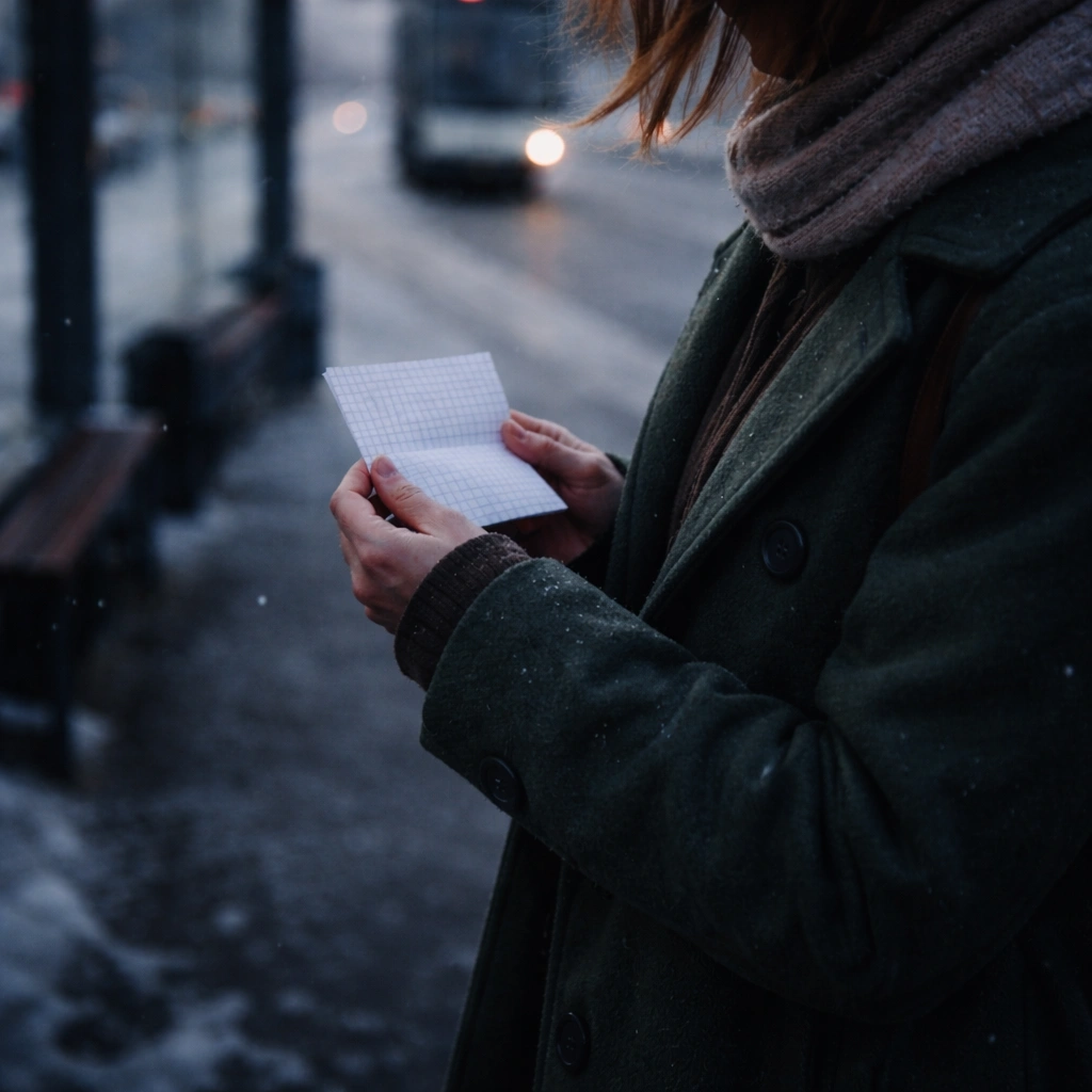 Я засунула руки в карманы – привычка с детства – и пальцы наткнулись на бумагу. Листок в клетку, сложенный вчетверо. Я развернула его прямо на остановке, под ледяным ветром.