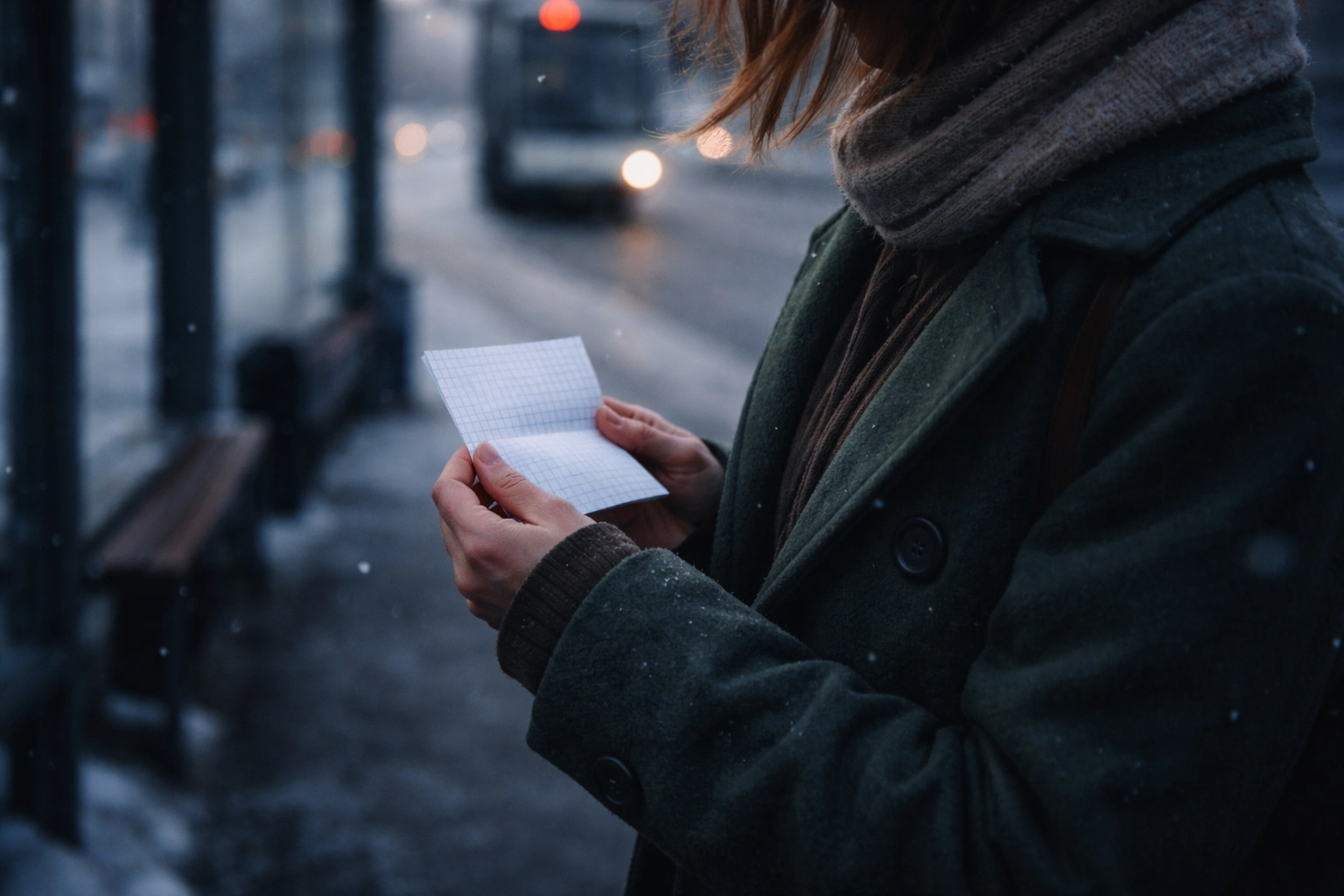 Я засунула руки в карманы – привычка с детства – и пальцы наткнулись на бумагу. Листок в клетку, сложенный вчетверо. Я развернула его прямо на остановке, под ледяным ветром.