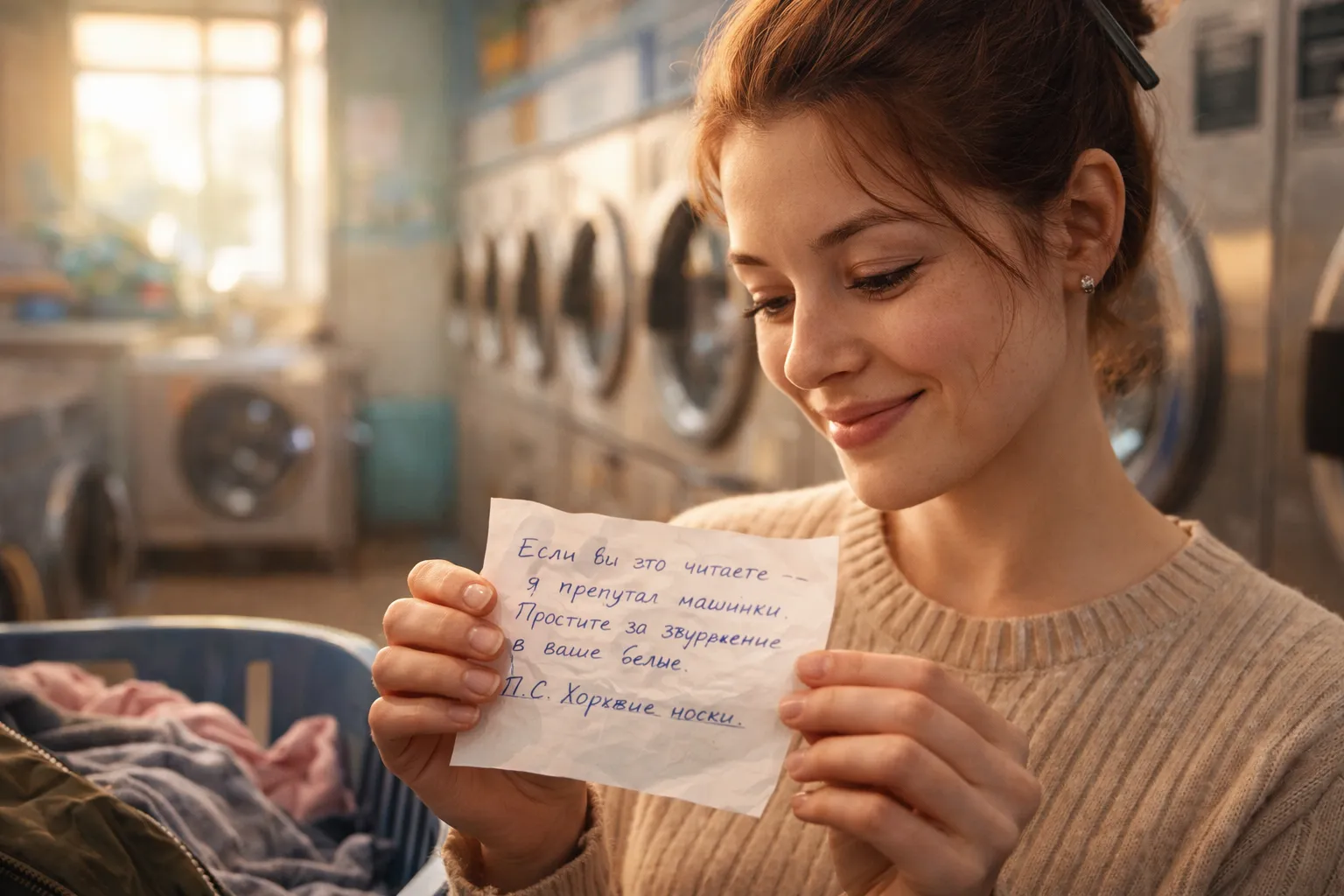 «Если вы это читаете – я перепутал машинки. Простите за вторжение в ваше бельё. P.S. Хорошие носки».