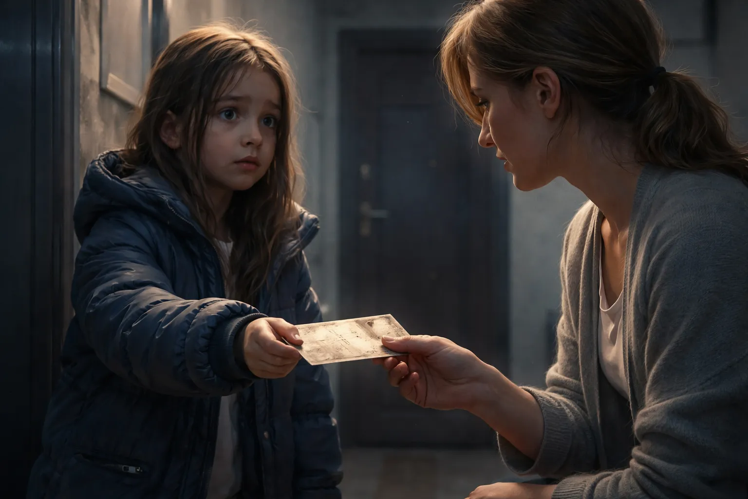 Марина открыла дверь. Девочка смотрела на неё снизу вверх – глаза сухие, но губы дрожали. Она не плакала. Она держалась. И это было страшнее слёз.
