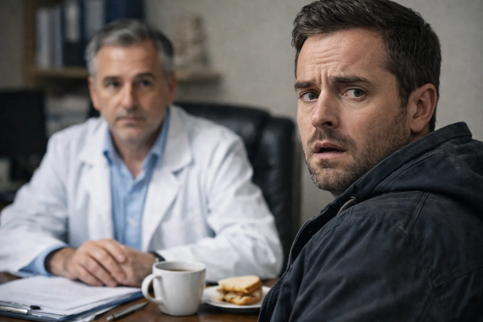 Доктор, спокойный мужчина средних лет с седеющими висками и в слегка помятом белом халате, удивлённо поднял брови, когда Виктор ворвался в кабинет без приглашения. Врач сидел за столом, перебирал какие‑то бумаги и, похоже, обедал прямо на месте – рядом стояла чашка остывшего чая и наполовину съеденный бутерброд.
