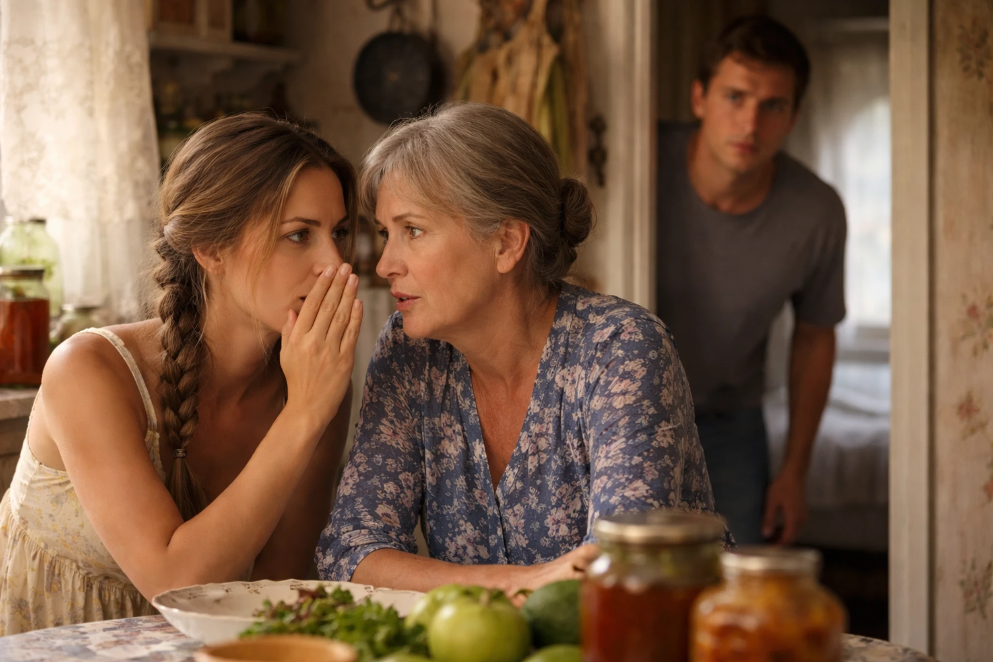 Девушка быстро накрыла на стол, достала из погреба салаты и соленья, а потом обняла мужа за плечи.
