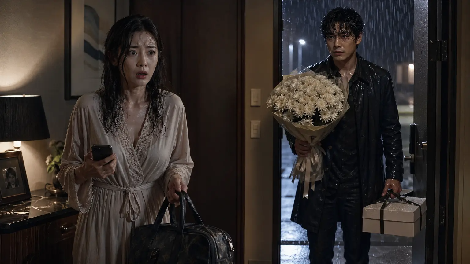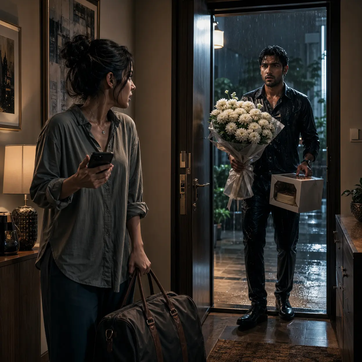 Звук был настолько громким и неожиданным в тишине квартиры, что я подпрыгнула на месте. Сердце ухнуло куда-то в пятки. Я на цыпочках, стараясь не дышать, подошла к прихожей. Дверь открылась, и на пороге появился Паша. Мой муж. Живой, здоровый, абсолютно целый, но насквозь промокший. В руках он держал огромный букет белых хризантем, с которых на пол капала вода, а под мышкой — картонную коробку из нашей любимой кондитерской. Он стряхнул воду с волос, поднял глаза и замер.