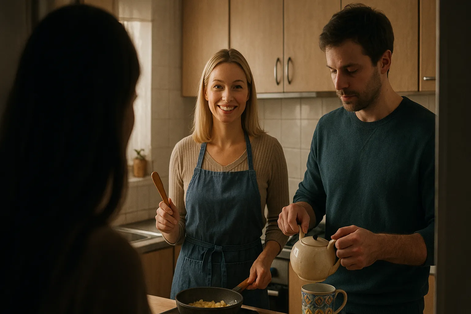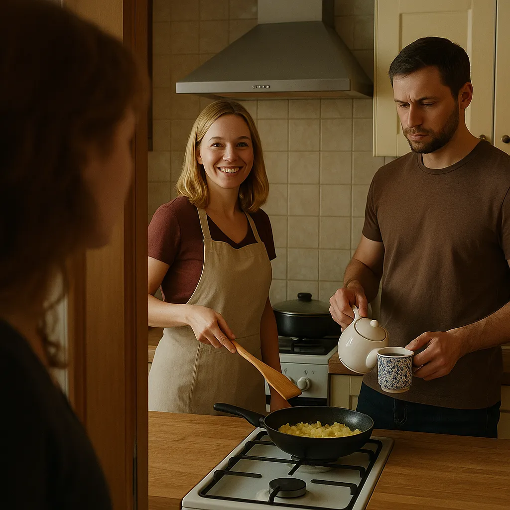 Я толкнула дверь — на кухне пахло картошкой, и за плитой стояла соседка Лена. Она улыбнулась мне так уверенно, будто всегда жила у нас.