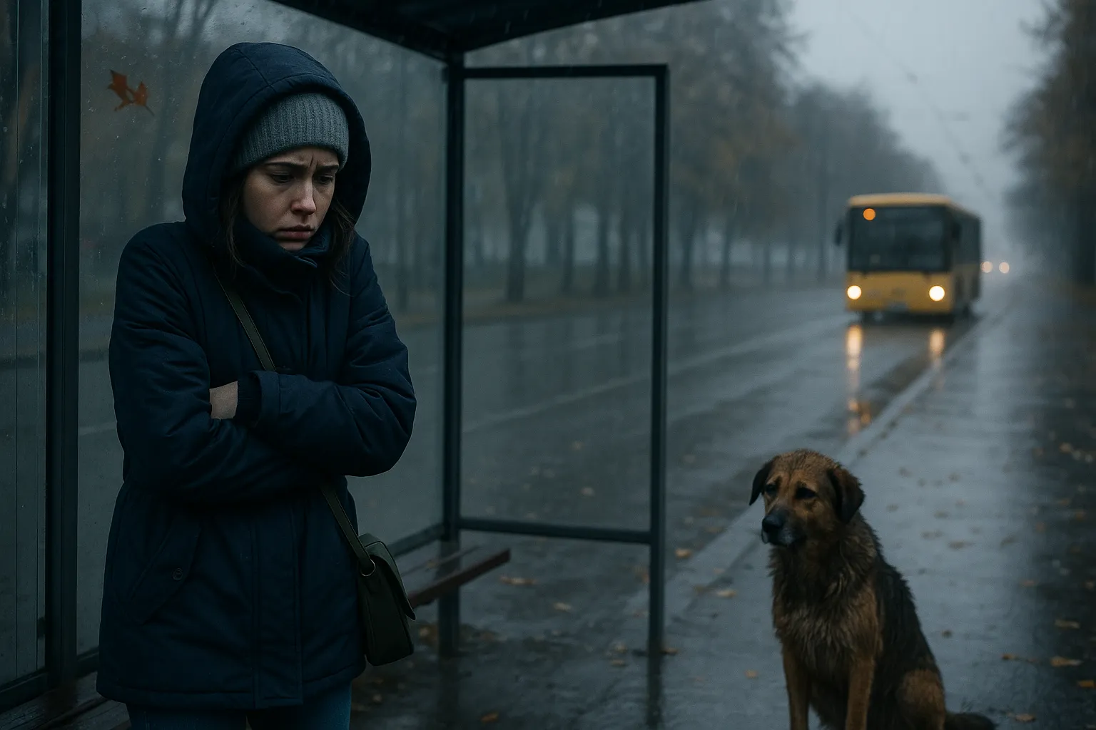 Тут подошел её автобус, и Юля быстро села в него. Пока двери не закрылись, она смотрела на пса, а он с укором смотрел на неё. Тут к остановке подошла молодая пара, и пёс поковылял прочь. В сердце Юли заползла тоска и жалость. Двери захлопнулись и, дёрнувшись, автобус поехал прочь.