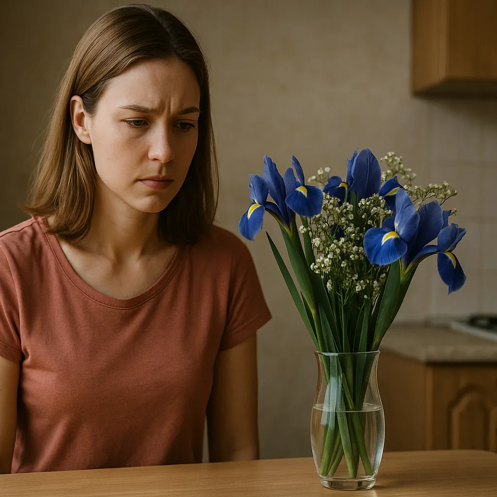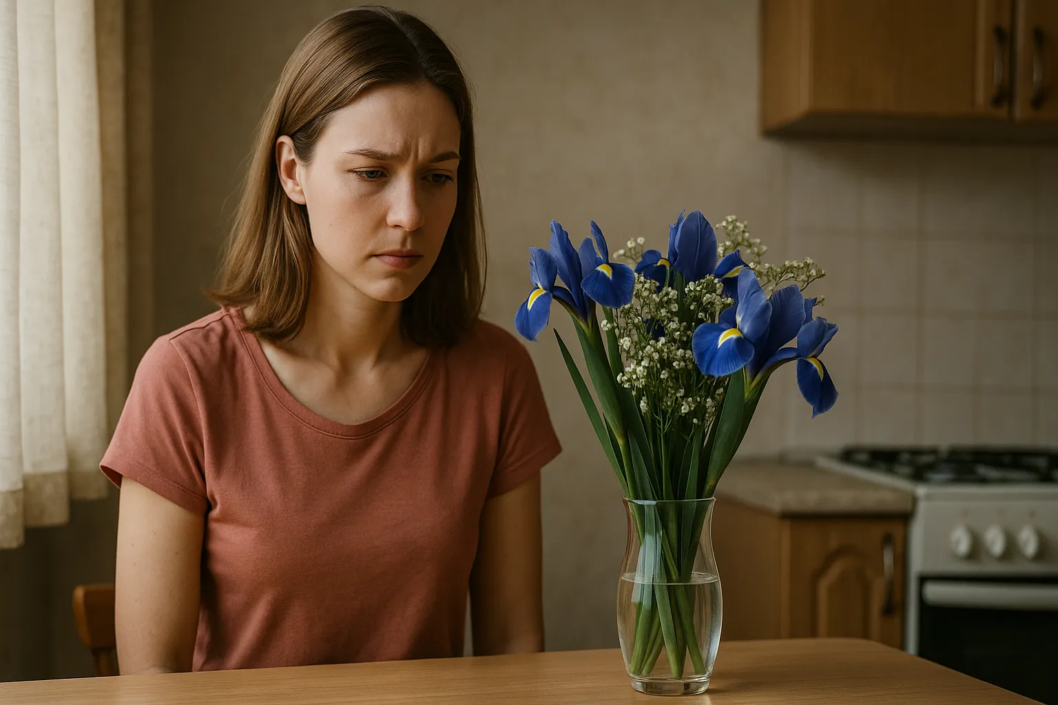 Дина закрыла за ним дверь и пошла в кухню, уставилась на цветы. Букет был красивым и именно с ее любимыми синими ирисами, и еще какие-то мелкие цветочки. Она осмотрела букет, ничего не увидела.