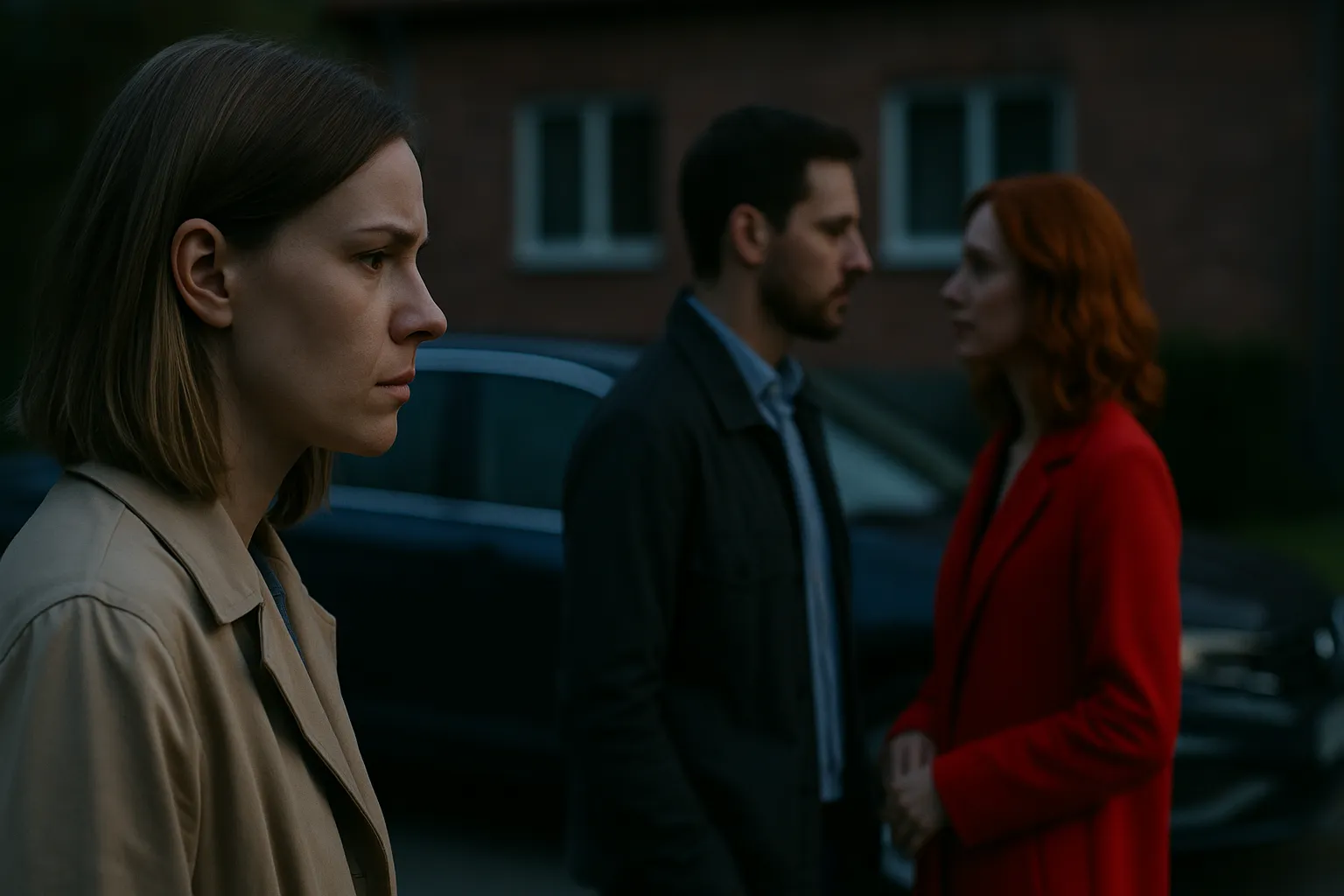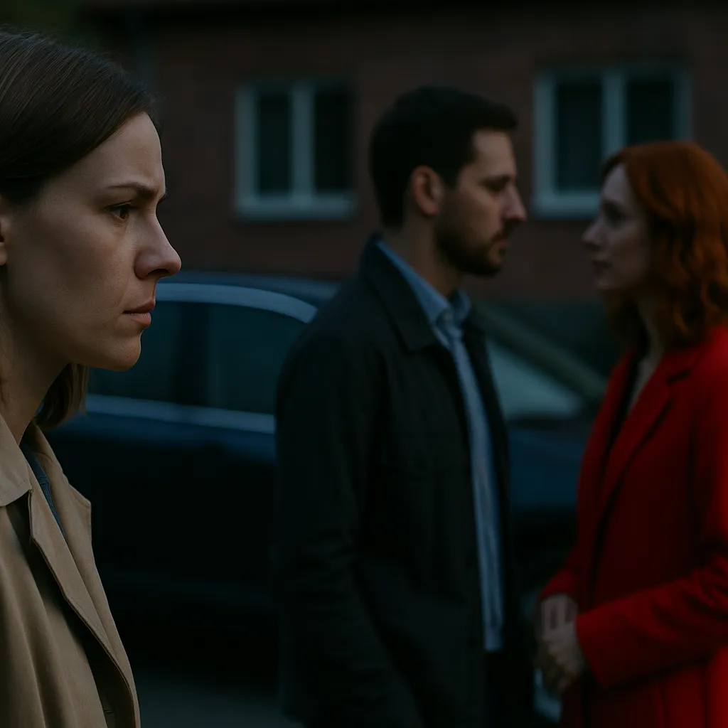 Елизавета возвращалась домой, и вдруг её внимание привлекла знакомая машина, принадлежащая её мужу, припаркованная у дома по соседству. Остановившись для лучшего обзора, она заметила, как из автомобиля вышел Алексей, сопровождаемый рыжеволосой дамой в вызывающе ярком пальто. Их поцелуй был далёк от дружеского приветствия коллег.
