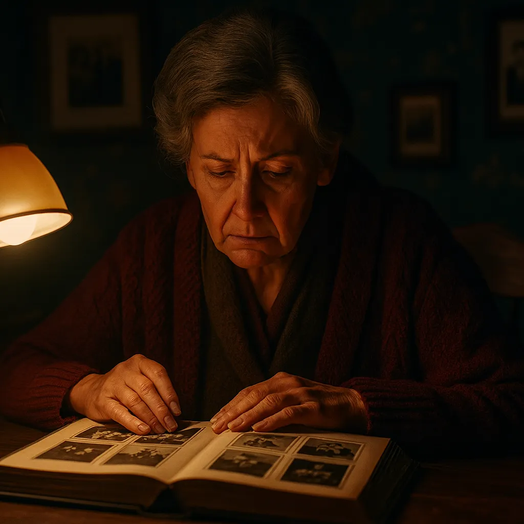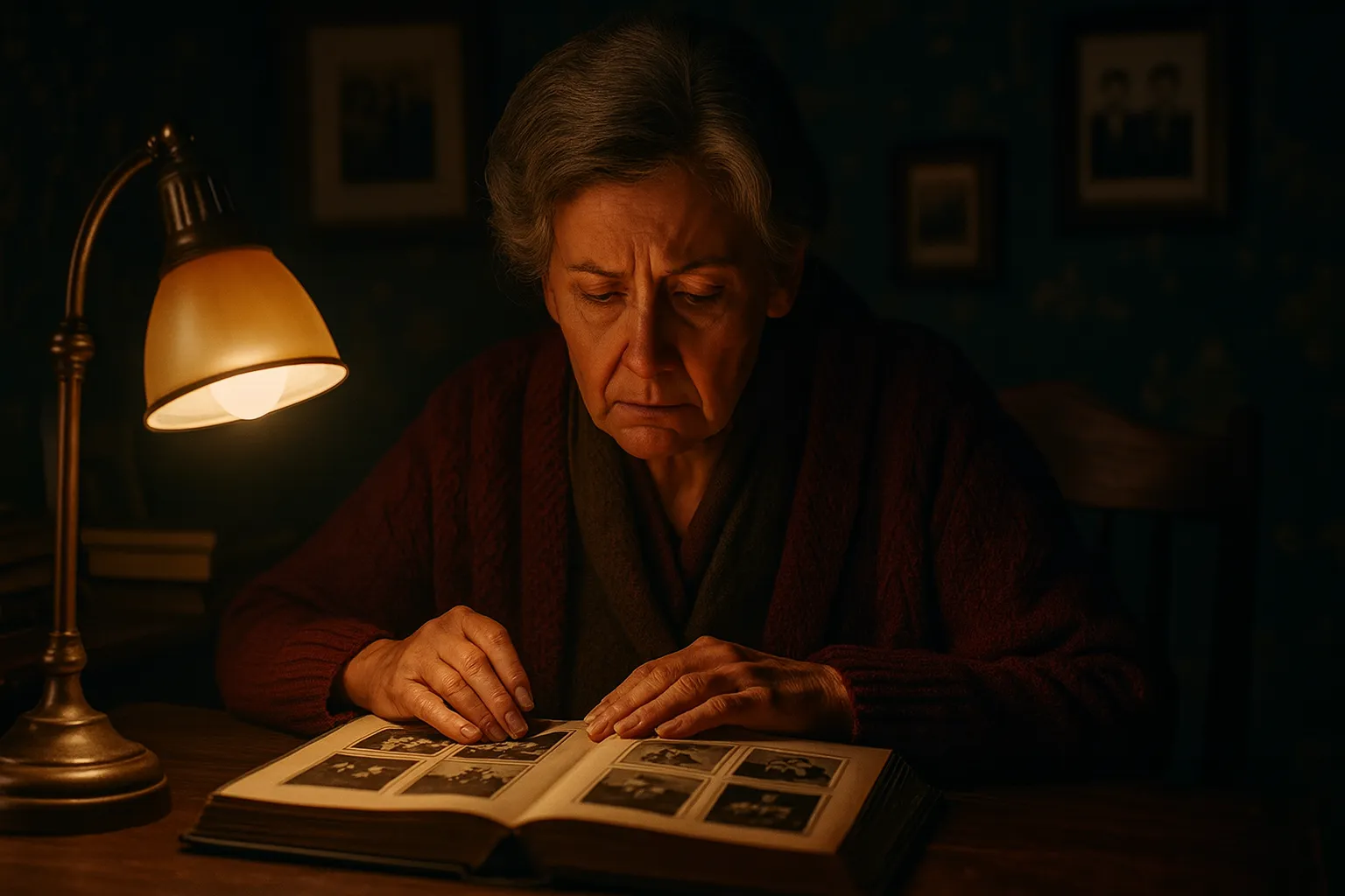 В тусклом свете настольной лампы Светлана Ивановна склонилась над старым альбомом. Её пальцы бережно переворачивали пожелтевшие страницы, а в глазах застыли слёзы. Альбом был огромным – словно книга жизни, каждая страница которой хранила свои тайны и воспоминания. Черно-белые фотографии соседствовали с более поздними цветными снимками, и каждая из них рассказывала свою историю.