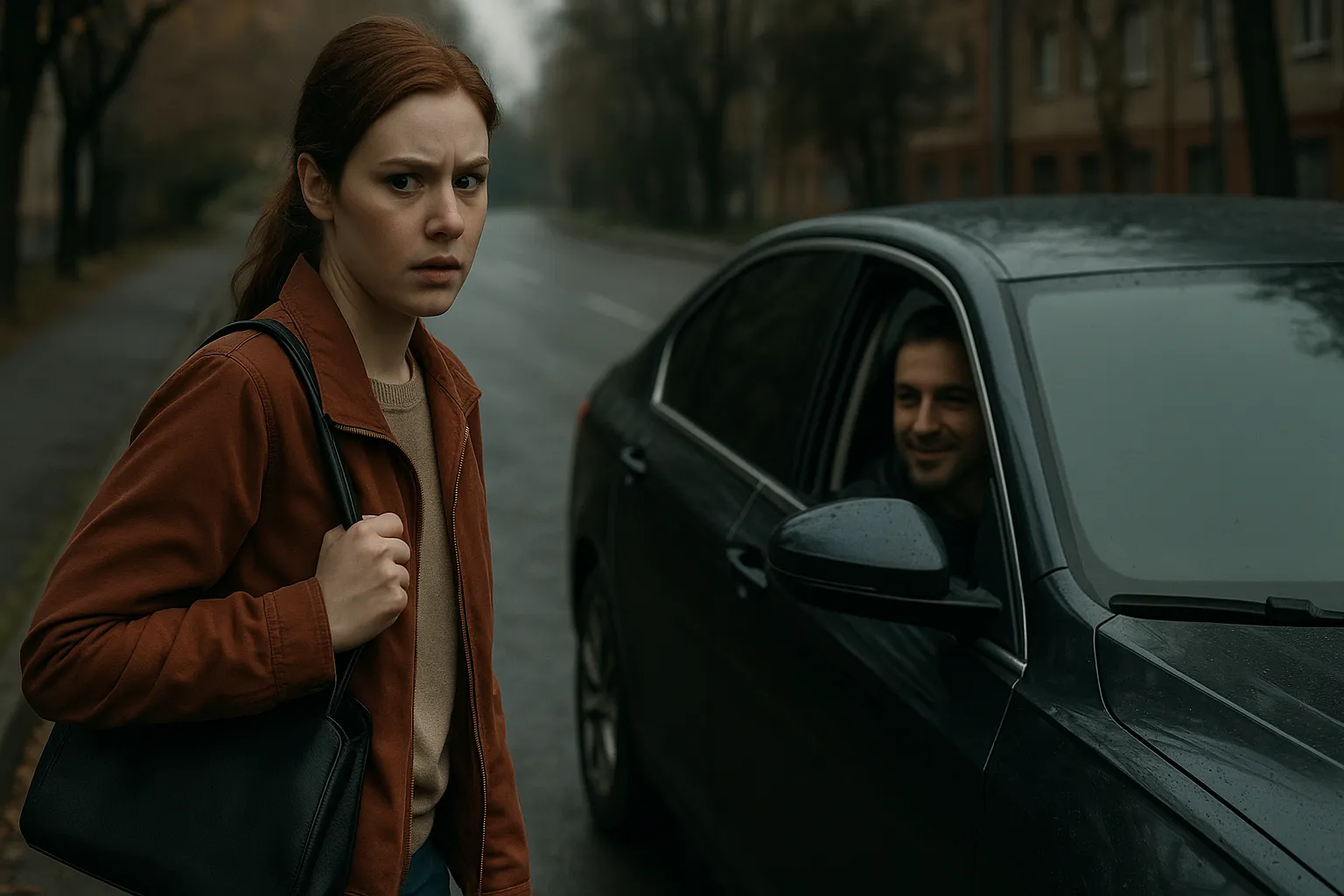 Алёна шла быстрым шагом, стараясь не показывать, что нервничает. Она по‑прежнему крепко сжимала ручку сумочки, время от времени поглядывая через плечо. Машина всё ещё медленно двигалась следом, держась в паре метров позади.