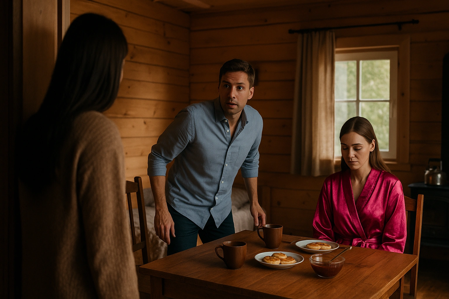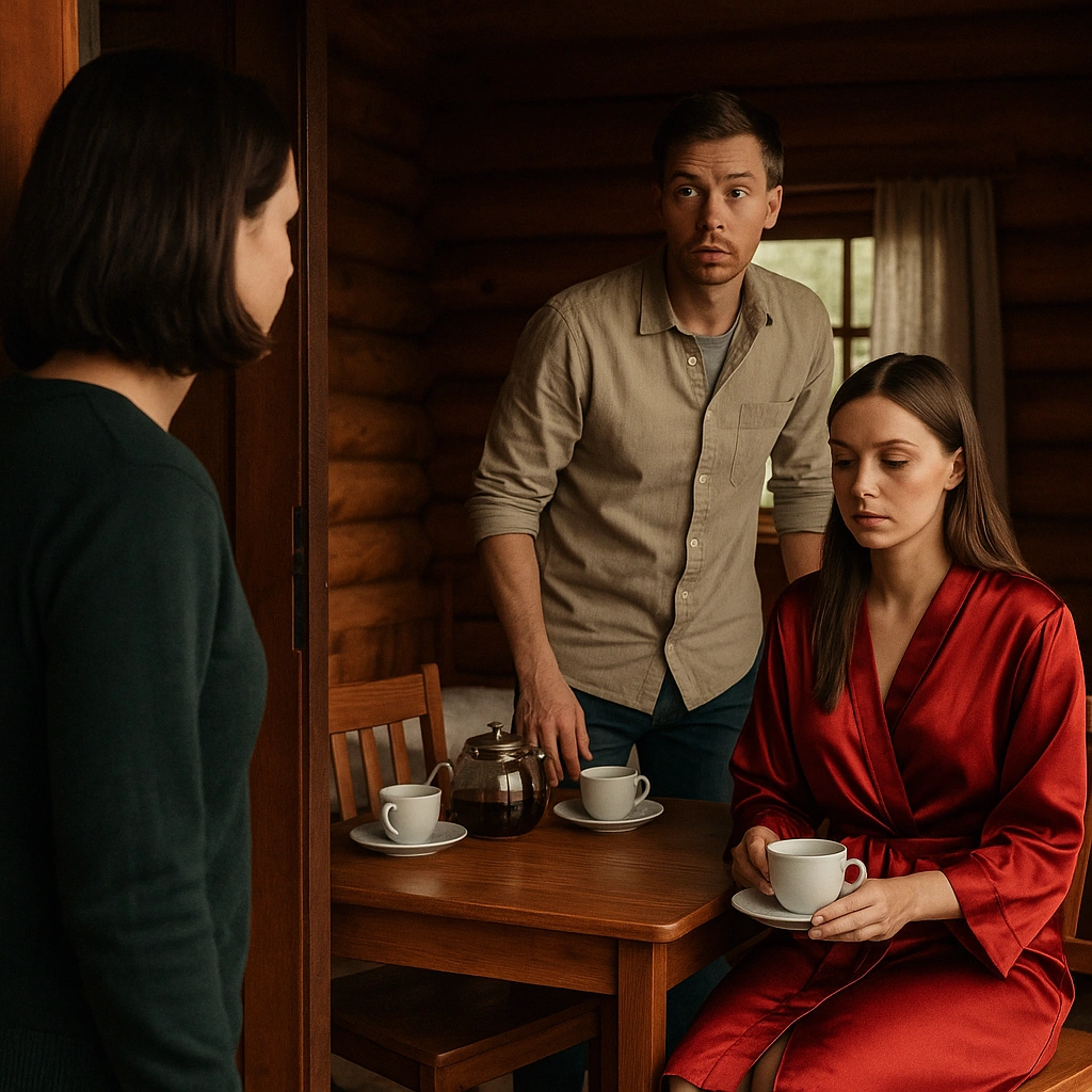 Дачный домик небольшой, открыла дверь и сразу попала в комнату. За столом сидел Володя, а напротив него – Ксения, в ярком атласном халате. Они пили чай.