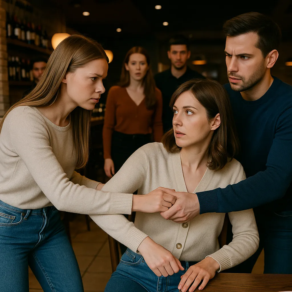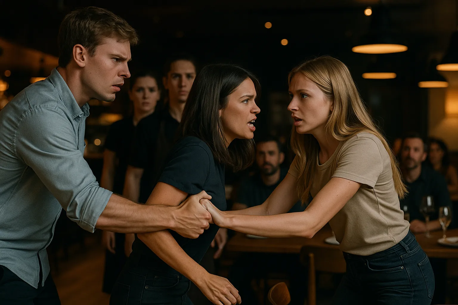 Официанты замерли у стойки, посетители притихли, наблюдая за разворачивающейся драмой. Маша инстинктивно вскочила со стула, готовая вмешаться, а Игорь рванулся вперёд, пытаясь преградить Карине путь.