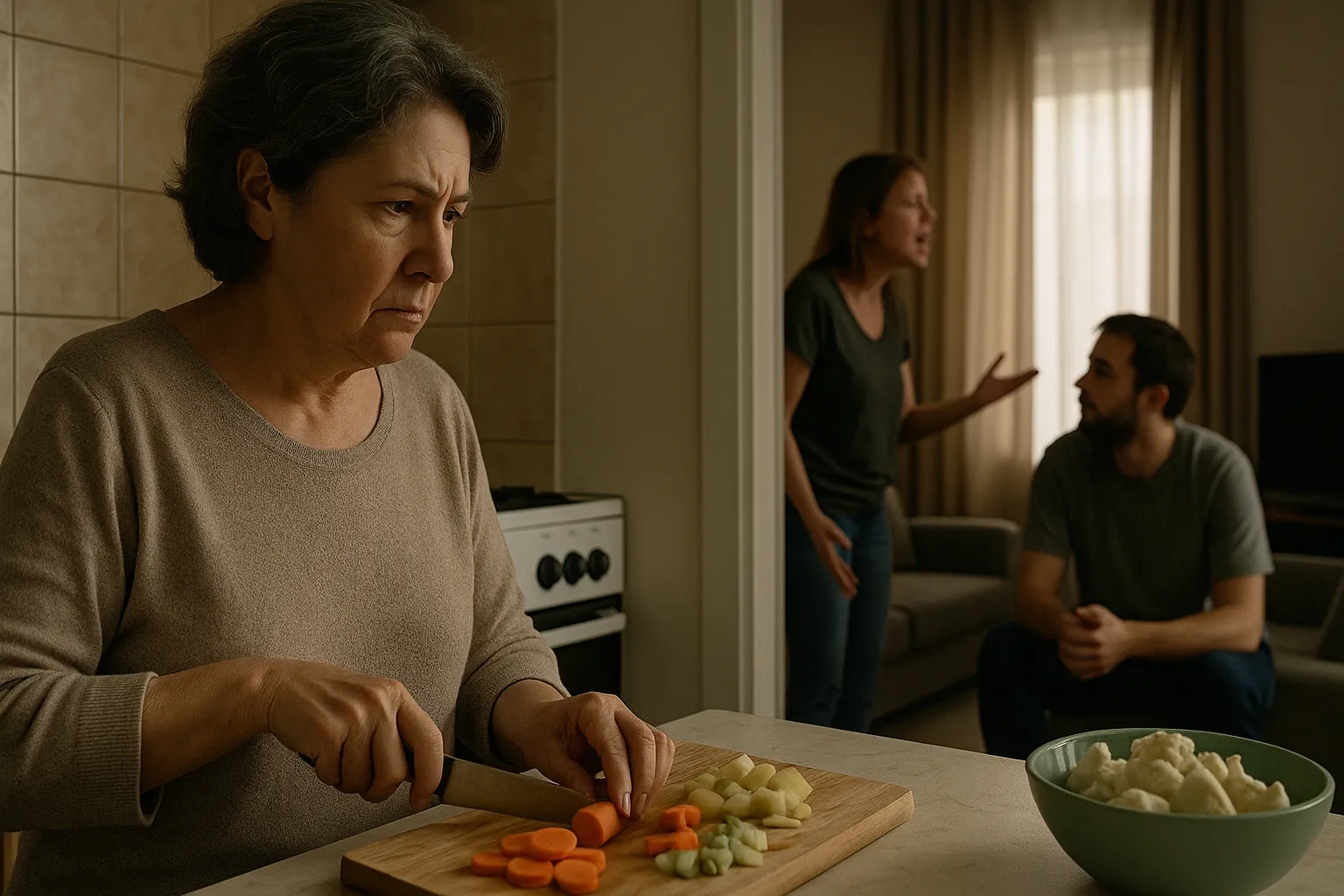 Надежда стояла на кухне и резала овощи для супа, когда услышала голос невестки из комнаты. Громкий, взвинченный, почти истерический.