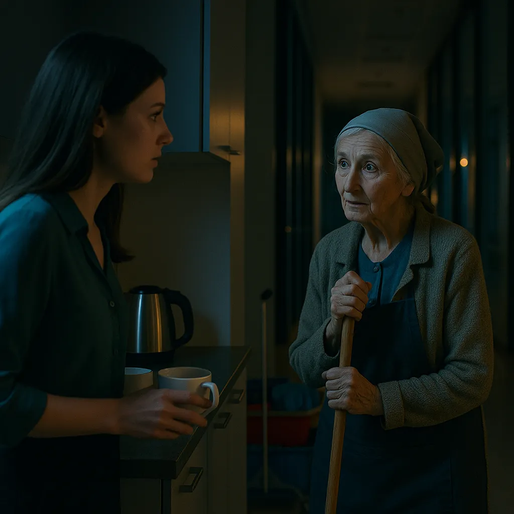 Она включила чайник и достала чашки, с удивлением заметив, что свет в коридоре включился. Странно, ведь все уже ушли. Марина выглянула и увидела пожилую женщину с тележкой, наполненной чистящими средствами — одну из уборщиц, которые обычно приходили поздно вечером, когда сотрудники уже разошлись.
