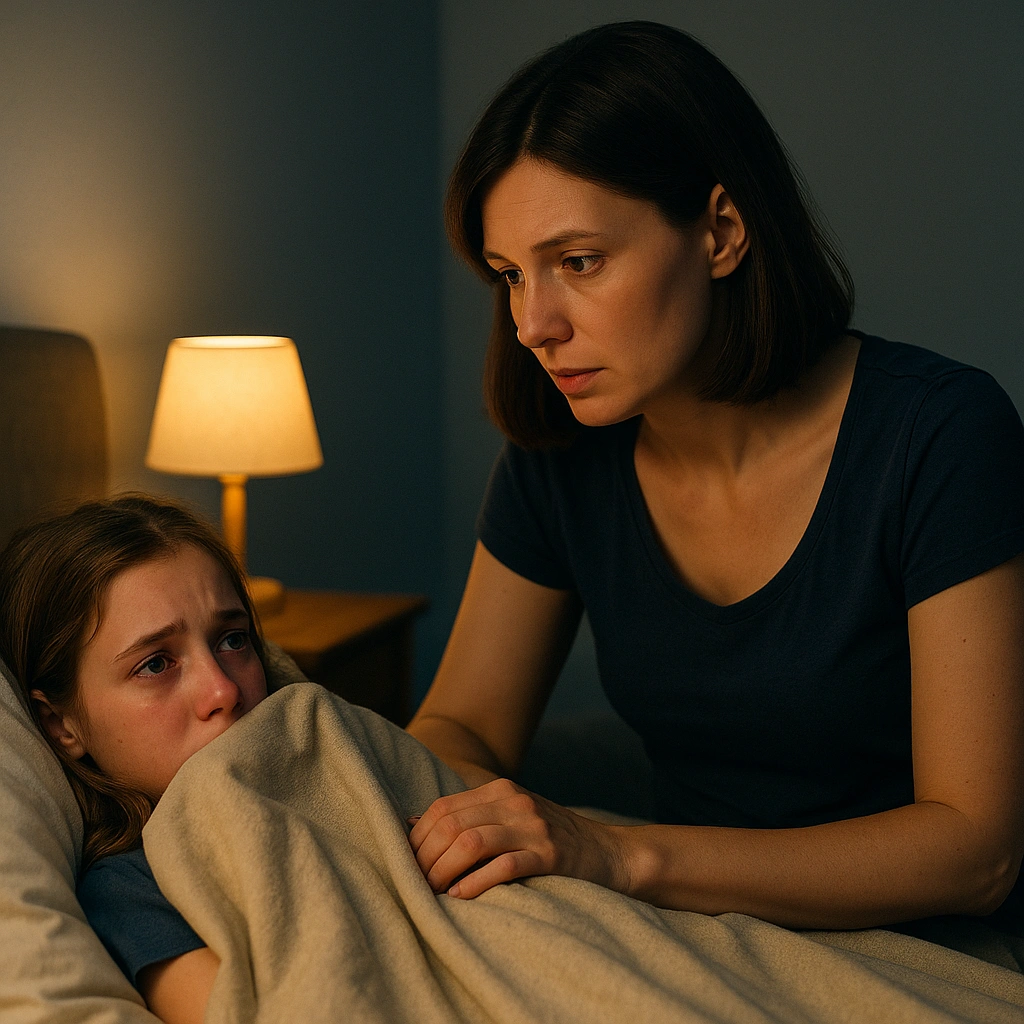 Елена присела на край кушетки, и вдруг Лера выглянула из-под одеяла. Лицо мокрое от слёз, глаза красные.