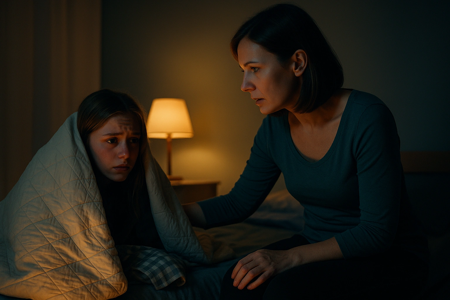 Елена присела на край кушетки, и вдруг Лера выглянула из-под одеяла. Лицо мокрое от слёз, глаза красные.